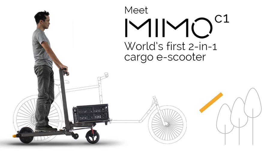 Left: first transformable prototype 2019. Right: MIMO C3 transformable three wheel cargo e-scooter 2025
