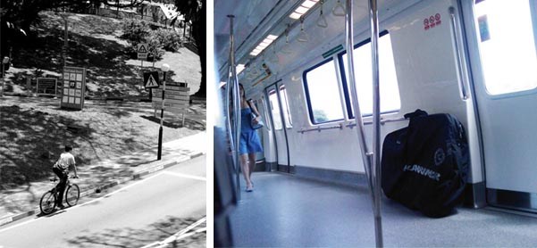 Photograph of me cycling in university taken by my engineering classmate James, and my plan to carry a steel frame road bike on the train for first to last mile.